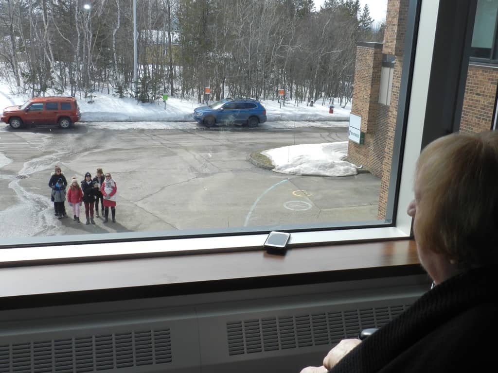 Ils ont préparé une affiche « On t’aime grand-maman » et se sont rendus sur le stationnement du CHSLD pour lui faire la surprise. Avec la complicité de la personne responsable de l’animation à l’intérieur de l’établissement, Mme Pelletier a pu se rendre à la fenêtre et a même parlé par téléphone simultanément avec sa petite famille.