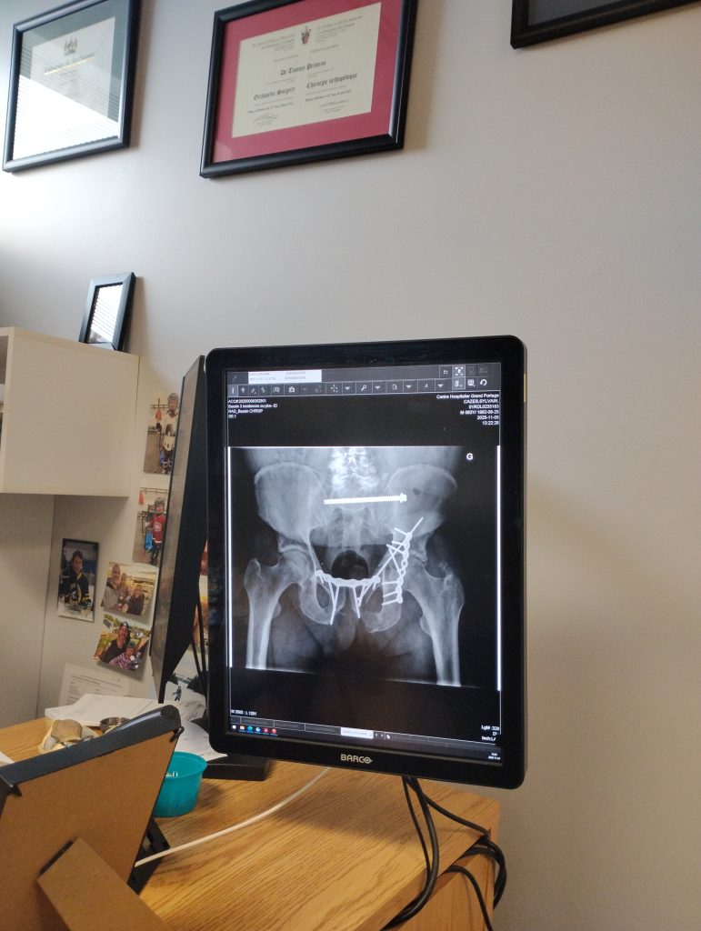 En réadaptation, son moral descend. « La nourriture n’était pas mangeable. J’ai perdu 27 livres. » Il finit par imposer son menu de survie : soupe, yogourt, jello, café. Puis, il peut enfin rentrer chez lui avec un suivi tous les deux mois. « J’ai dû attendre douze semaines pour la consolidation avant de mettre du poids. Lorsque j’ai pu me lever, j’ai demandé à voir mes radiographies pour comprendre ce qu’on m’avait fait. » Il est frappé. « Quand je montre ces images aux gens, ils me demandent comment je fais pour être encore debout ».