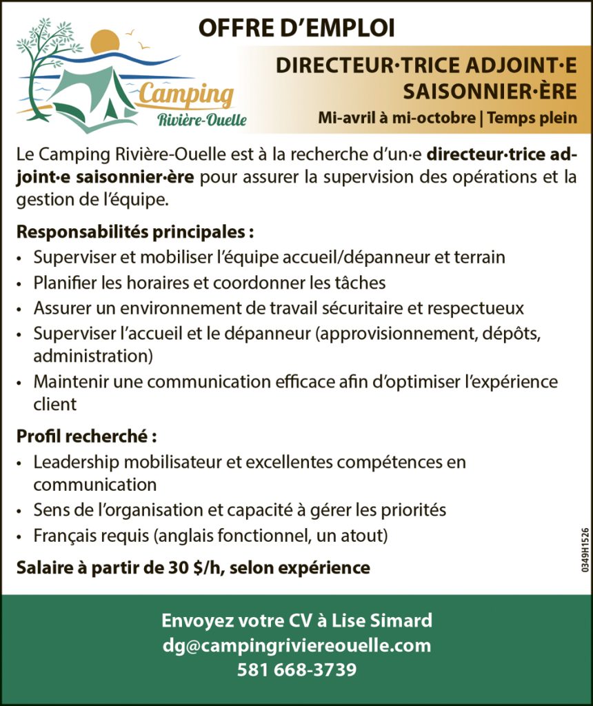DIRECTEUR·TRICE ADJOINT·E SAISONNIER·ÈRE – Camping Rivière-Ouelle Pour postuler : dg@campingriviereouelle.com