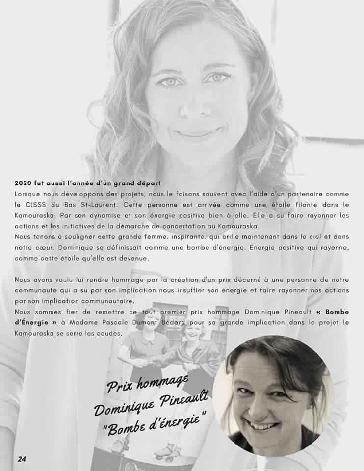 Il était clair pour Moisson Kamouraska que sa mémoire devait perdurer. C’est ainsi que le prix Dominique Pineault a été créé et sera attribué à d’autres personnes inspirantes du milieu qui font la différence pour l’organisme. La première récipiendaire est Pascale Dumont-Bédard, instigatrice de Kamouraska se serre les coudes, alors qu’elle dirigeait Promotion Kamouraska.