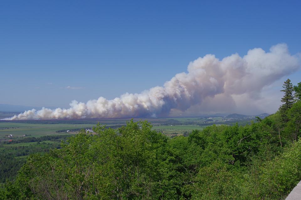 Un imposant panache de fumée est visible, en raison d’un incendie de tourbe aux Tourbières Lambert. Le travail est compliqué par une intense chaleur et de forts vents.