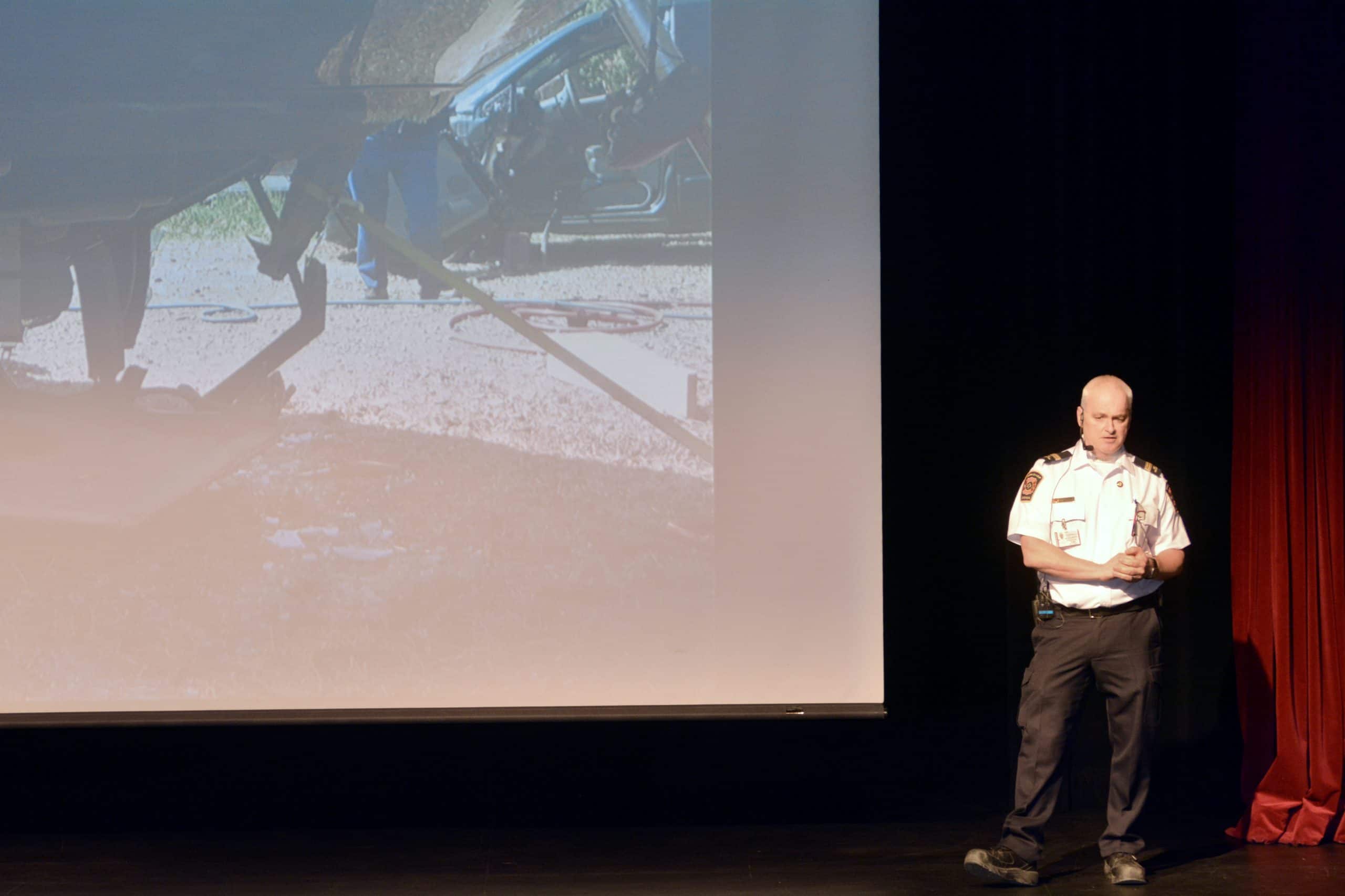 Cette fois, une série d’intervenants — policiers de la Sûreté du Québec, paramédic, pompier, préventionniste à la SAAQ, physiothérapeute — se sont succédé sur scène pour expliquer les conséquences diverses à la suite d’un accident de la route. L’ensemble des présentations allaient droit au but et étaient bien adaptées au public cible, des jeunes âgées pour la plupart entre 16 et 17 ans, dont plus de la moitié de la salle possédait déjà ou était en voie d’obtenir son permis de conduire.