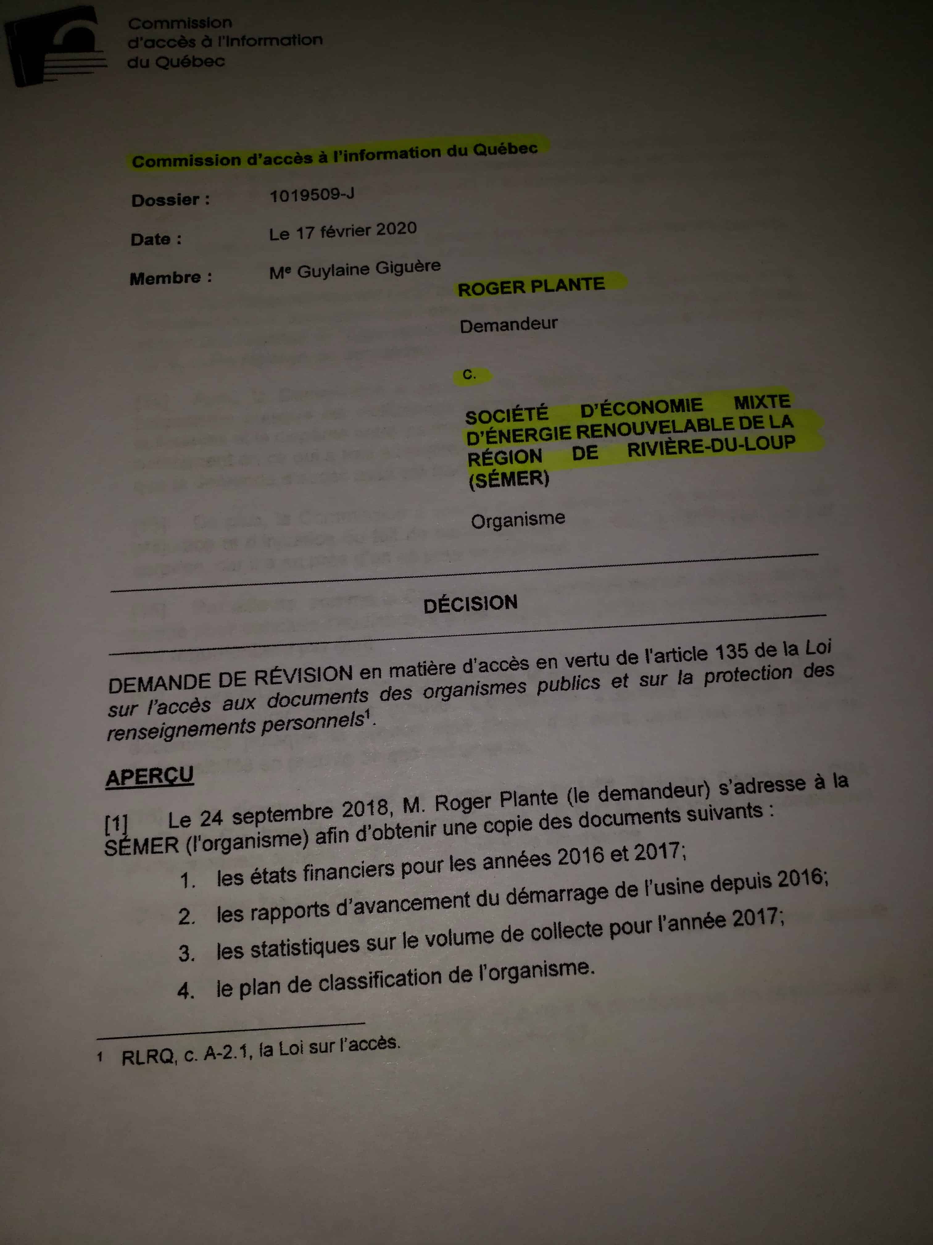 La Commission d’accès à l’information du Québec a tranché, suite à la demande qui remonte au 17 octobre 2018 de Roger Plante, du Réseau d’information sur les municipalités.